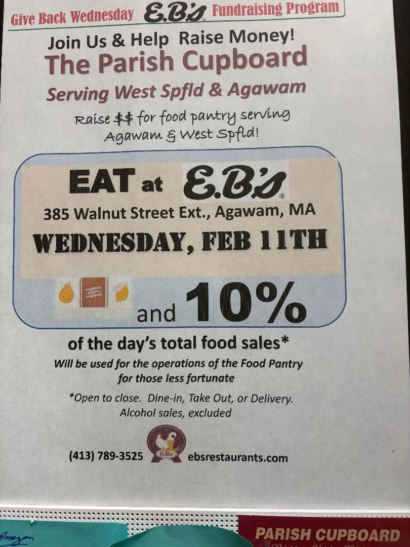 The Parish Cupboard provides meals and groceries to individuals and families in need throughout West Springfield, Agawam, and Feeding Hills.
